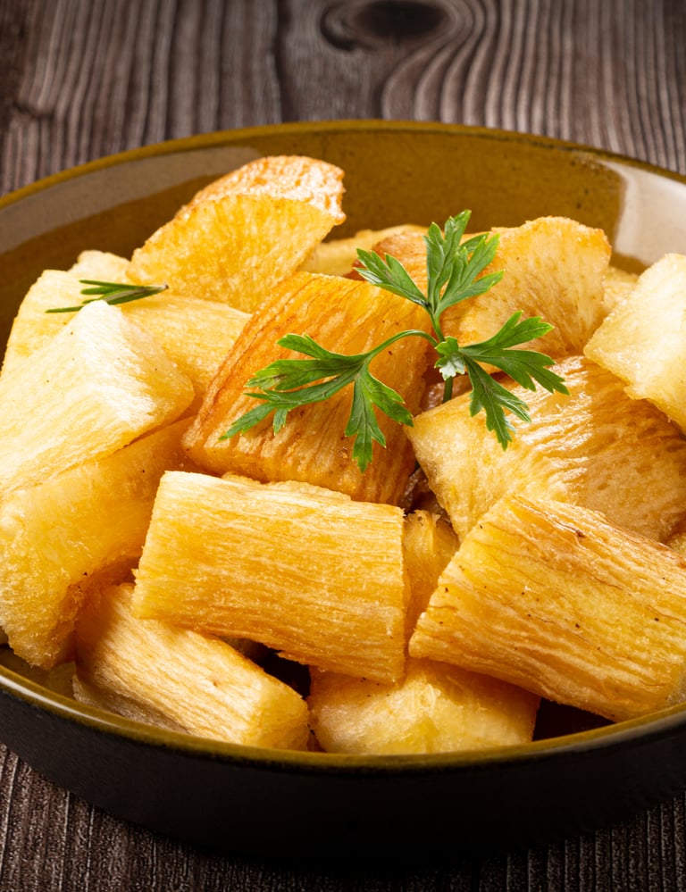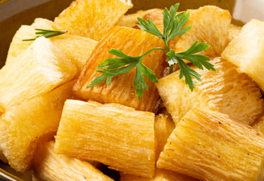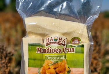 Toletes de mandioca com 10 á 7 cm, picados e descascados, ideal para Food Service.